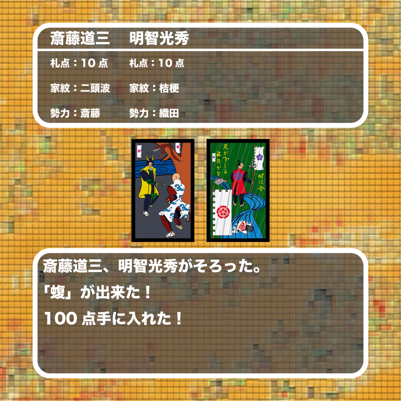 ・戦国花札のなかで「斎藤道三」の出来役は、梟雄、蝮の合計2役です。